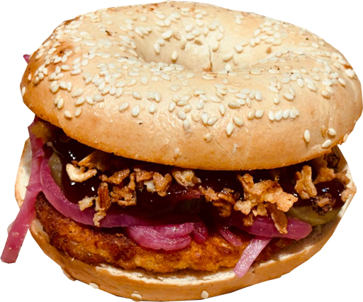 Bagel filled with 2 hash browns, crispy fried onion, pickled red onion, gherkins, ketchup, mustard
